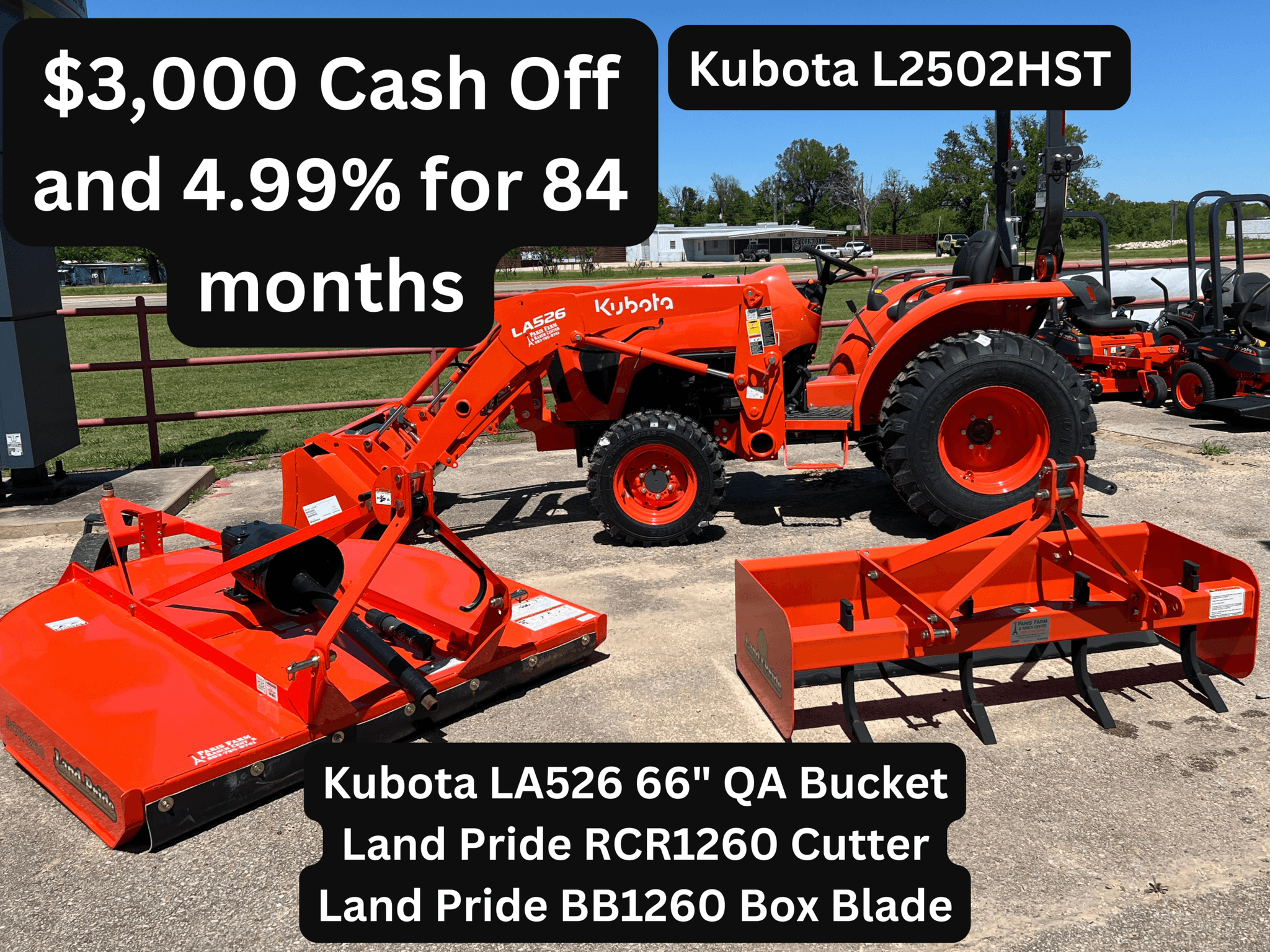* Package prices expire 06/302026. Financing is subject to approval with Kubota Credit Corporation. Package payments are calculated with 4.99% interest for 84 months and $3,000 cash off. See package page for more details. Taxes and insurance are not included in the package payments shown. See dealer for more information.